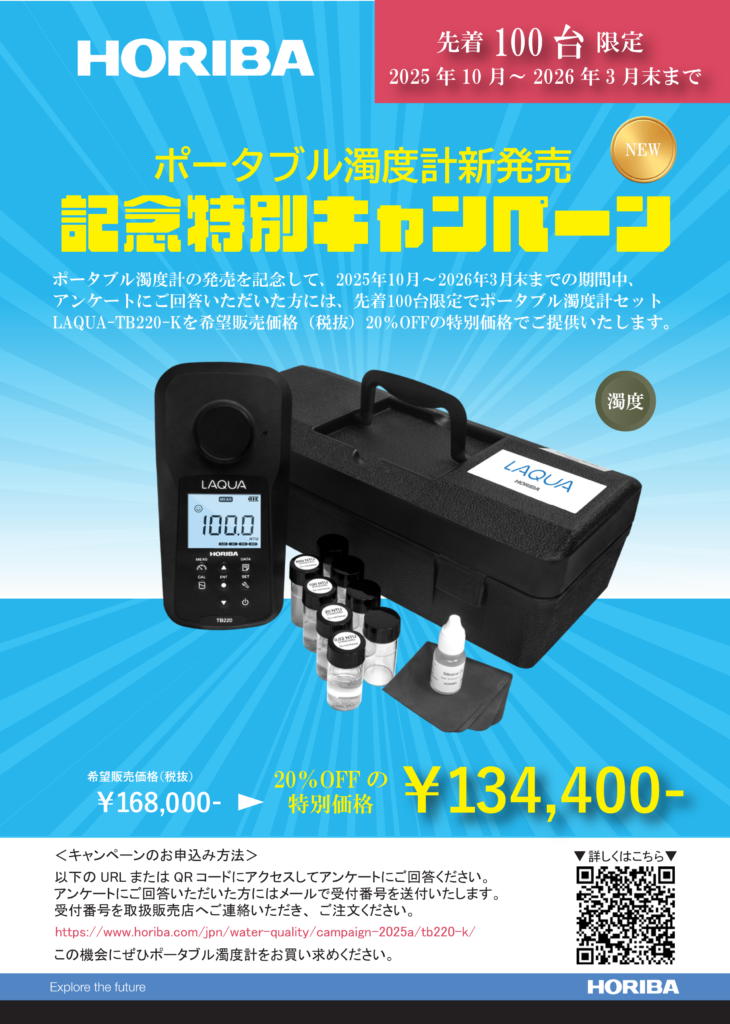 アンケートにご回答いただいた方限定! 先着100台限定でポータブル濁度計セット LAQUA-TB220-Kを希望販売価格(税抜)20%OFFの特別価格でご提供いたします。