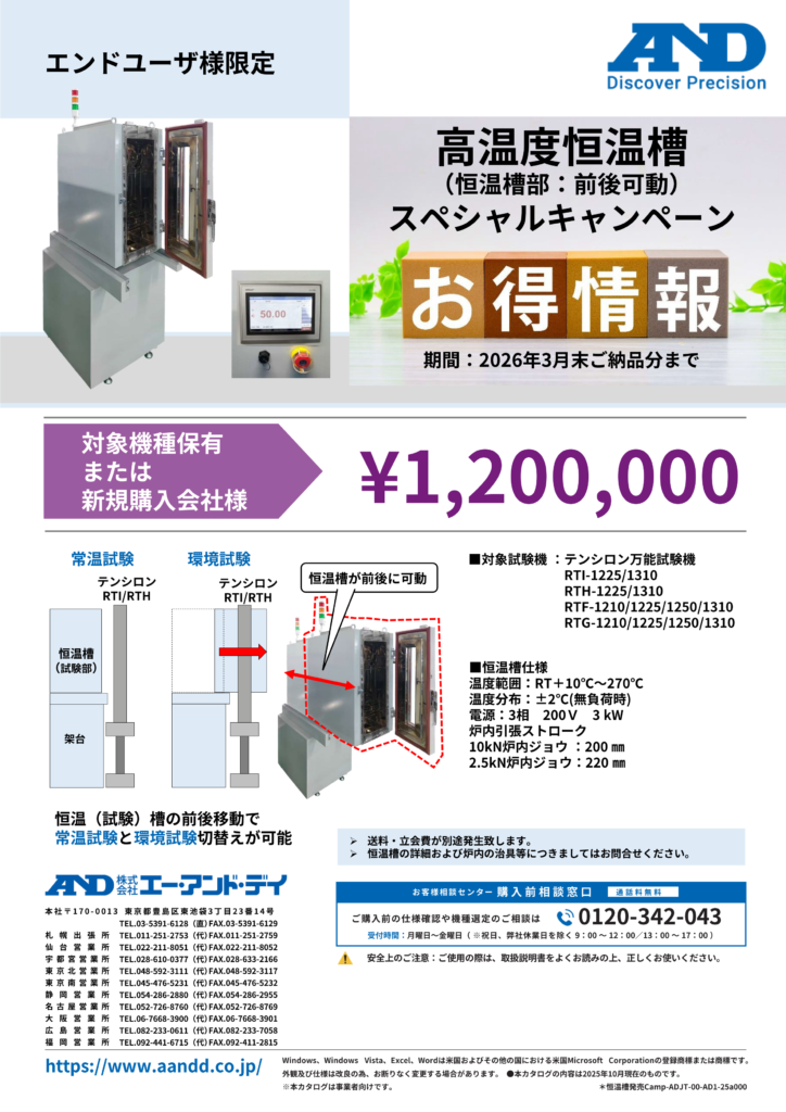 (株)エー・アンド・デイにて高温度恒温槽のスペシャルキャンペーンが開催中です。対象機器をお持ちの方または新規ご購入の方はお得な価格でお求めいただけます。ぜひこの機会をご活用ください。
