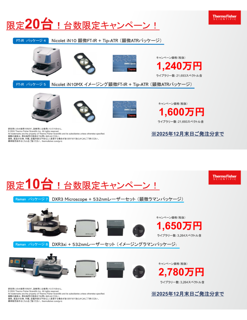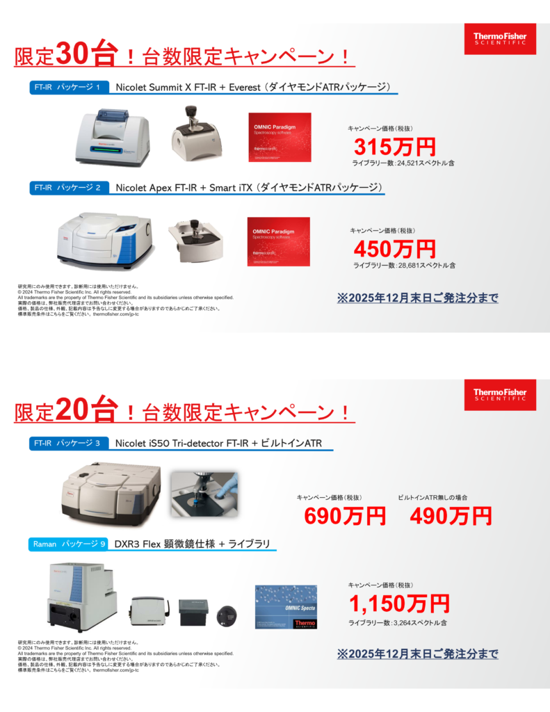 サーモフィッシャーサイエンティフィック(株)にて、FT-IRを特別価格でお求めいただけるキャンペーンを開催しています。各機器とも台数限定になっておりますので、ぜひお早目にご活用ください。