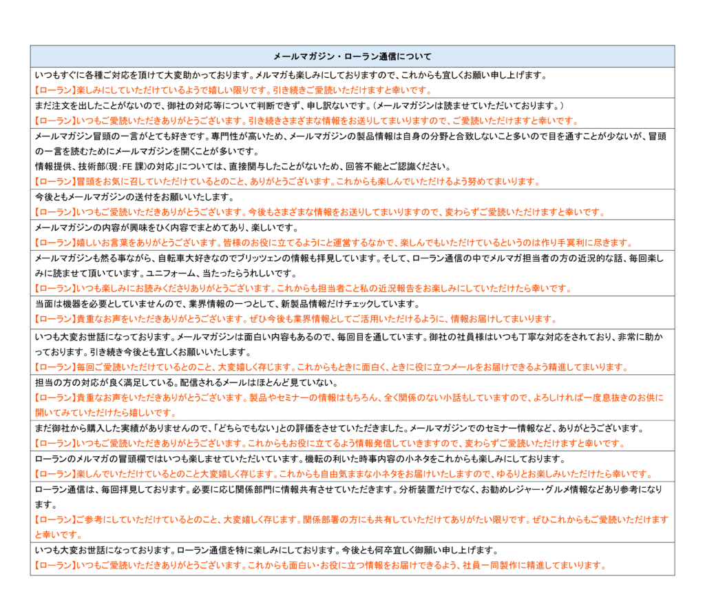メールマガジンにつきまして貴重なご意見いただきありがとうございました。今後の配信の参考にさせていただきます。皆様のお役に立つ情報をお届けできるよう努めてまいりますので、これからもかわらずご愛読いただけますと幸いです。