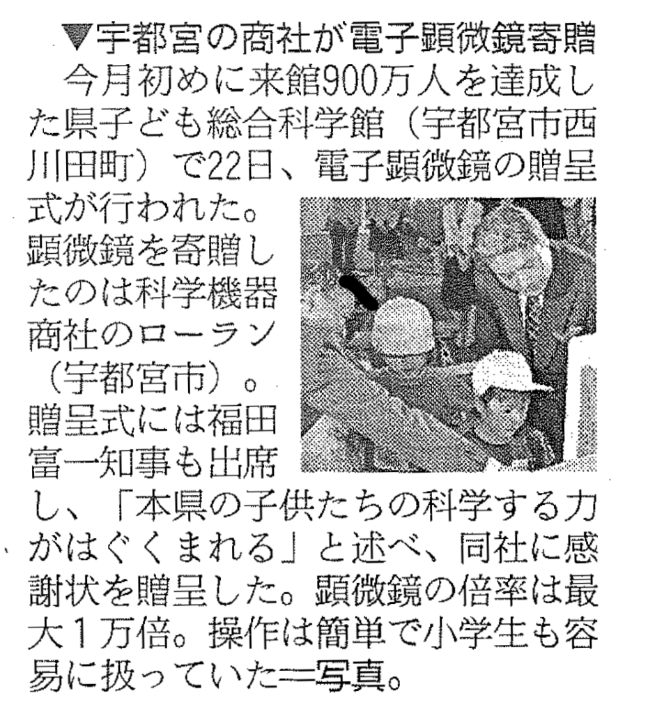 2007年5月22日、60周年記念行事の一環として、60年間、この地で事業を行わせて頂いた「地元への感謝の気持ち」と、科学機器商社として、取扱商品である「科学機器」を「子ども達の理科離れ対策」の一環として、栃木県子ども総合科学館に電子顕微鏡を寄贈いたしました。贈呈式には栃木県知事•福田富一氏も出席頂き、とちぎテレビ・下野新聞・産経新聞も取材にお越し頂き、盛大にとり行われました。 少しでも多くの子ども達が、電子顕微鏡に触れ、科学への大きな興味を抱いてくれれば嬉しく思います。そして、栃木県から将来世界に羽ばたく科学者の誕生を願っております。